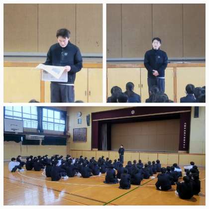 担当の先生から、冬休みの振り返りや能登半島地震の新聞記事の紹介などのお話がありました。