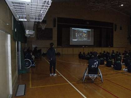 メンバー紹介での現役時代の試合のDVD鑑賞、クラス対抗の車いすリレー、ミニゲームなどを行い、貴重な体験となりました。最後に、プロ+教員VSバスケットボール部の試合が行われ、盛り上がりました。