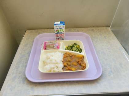 本日の給食は、チキンレバーカレーライス、きゅうりとコーンのサラダ、スイートポテトでした。久しぶりのカレーライスに喜んでいる人も多かったのではないでしょうか。