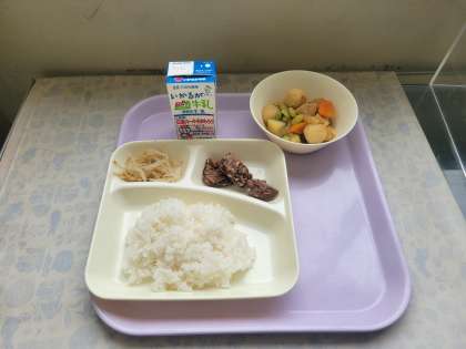本日の給食は、くじらのたつたあげ、まる天と野菜の煮もの、もやしのしょうがづけでした。