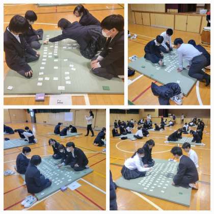 本日は午後から1年生が百人一首大会を行いました。すごくレベルが高い班もあり、上の句だけでの取り合いもたくさんありました。集計の間に、クラス対抗坊主めくり大会も行われていましたが、ぼうずを引いたときのリアクションが大きく、全員で盛り上がっていました。