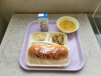 本日の給食は、豚肉のカレー風味焼き、コーンとはくさいのスープ、カリフラワーのレモンドレッシングでした。
