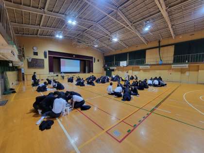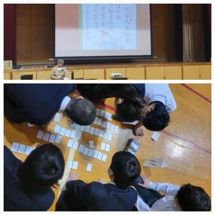 本日は午後から2年生が百人一首大会を行いました。どの班も盛り上がっています。上の句を詠んだ瞬間に札をとっている人もいました。