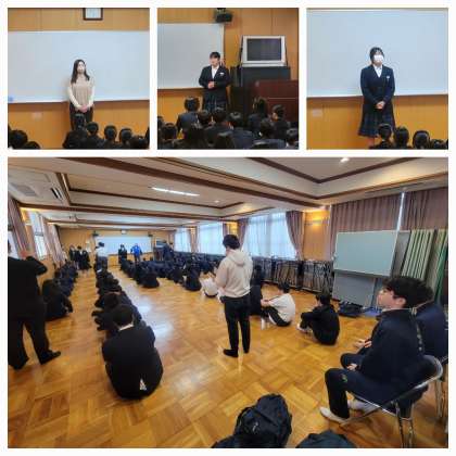 本日は朝から、2,3年生が学年集会を行いました。担当の先生や生徒からお話してくれていました。3年生の生徒からは、あと少しの中学校生活を充実したものにしましょうとお話してくれていました。