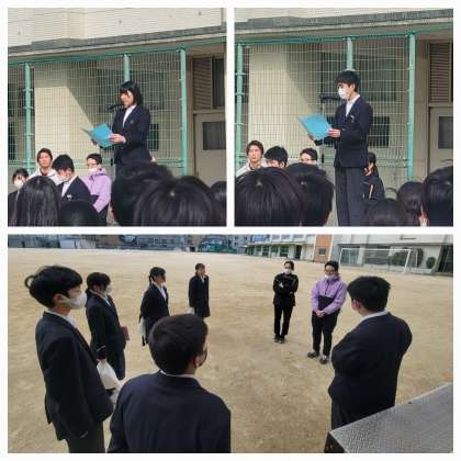 最後は、全校集会の体型で1,2年生代表で生徒会の人からお礼や来年からの決意などのお話をしてくれました。また、3年生の代表の人からは、これからの中学校を頼みますとの激励のお話をしてくれました。