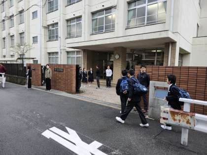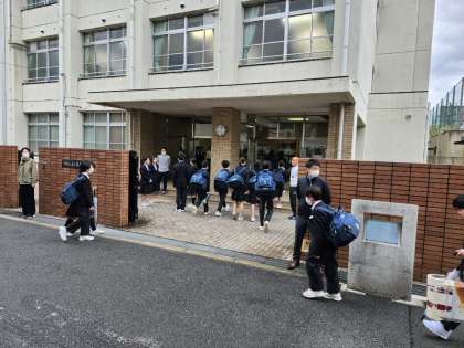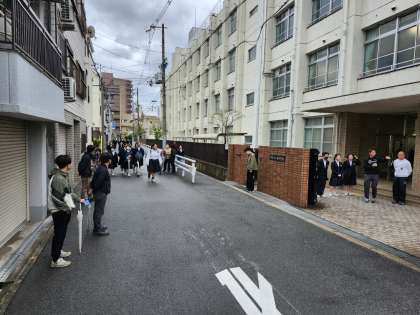 昨日の雨も止み、くもり空のもと2日目の登校のようすです。たくさんの先生も門に立ってくれており、みんな元気にあいさつを交わしています。