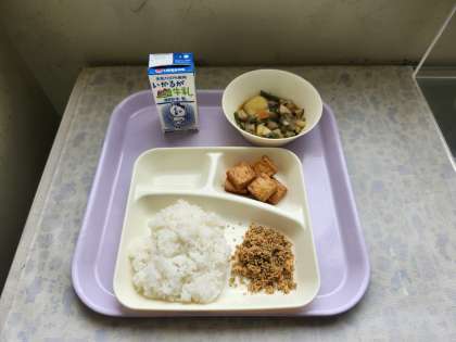 本日の給食は、鶏肉とじゃがいもの煮もの、あつあげのしょうゆだれかけ、紅さけそぼろでさした。