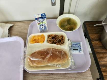 本日の給食は、じゃがいものミートグラタン、レタスのスープ、みかん(缶)でした。じゃがいものミートグラタンは、みんな大好きという味でした。パンには、ブルーベリージャムもついていておいしかったです。