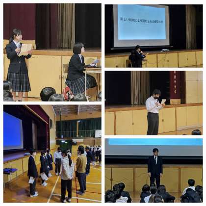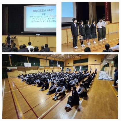 本日は生徒会の人から校則の見直し変更についての説明がありました。来週から男子のツーブロック、女子のヘアゴムの位置について新ルールとなります。皆さん一人一人が意識して行動しましょう。