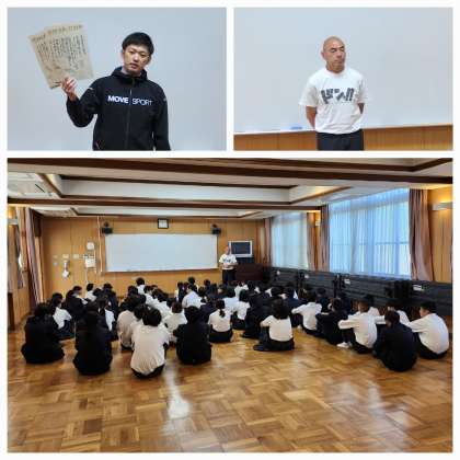 本日は朝から1年生が学年集会を行いました。担当の先生から、校舎のあちこちに「学校を良くする材料」「学校が悪くなる材料」という掲示物を目にします。