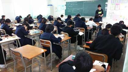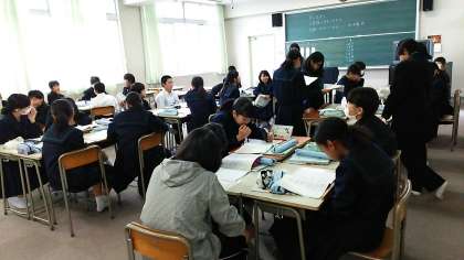 平成27年度第5回土曜授業として、授業参観を実施しました。上の写真は2年生社会科のようすです。下の写真は、音楽科の授業でグループワークをしているところです。