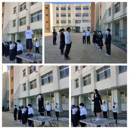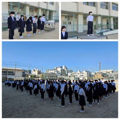 本日は朝からグラウンドで全校集会を行いました。整列してからチャイムがなるまでの1,2分間、誰もしゃべることなく待っている姿勢は素晴らしいものでした。保健委員の代表の人から、今月の目標のお話がありました。また、生徒会の担当の人から明日からのテストをがんばりましょうとお話をしてくれました。