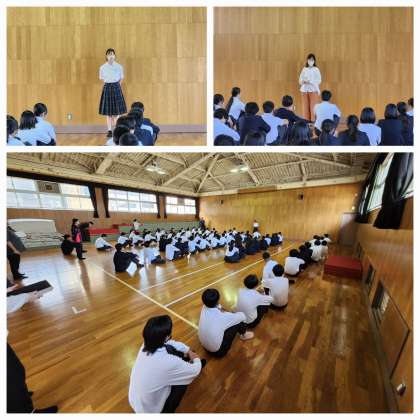 本日は朝から3年生が学年集会を行いました。担当の先生から、来月行われる修学旅行を成功させるには皆さんの意識が大切ですとのお話がありました。