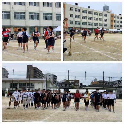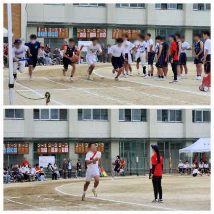 部活動リレーのようすです。各部活動ならではの用具をバトンにしてリレーを行っています。真剣勝負です。