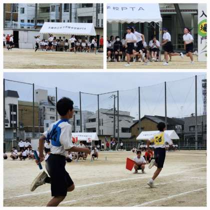 午後の部では、部活動リレーのあと1,2年生全員リレーを行いました。走ることが得意な人もそうでない人もクラス全員でバトンを受けついで頑張っていました。