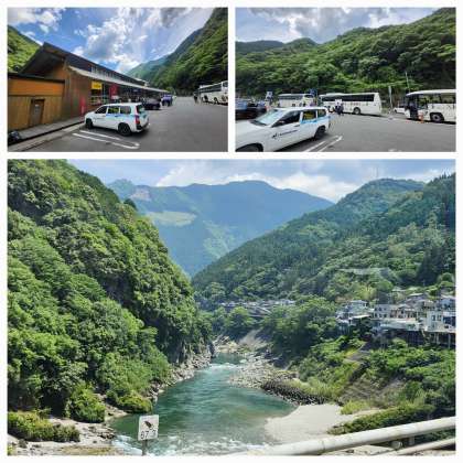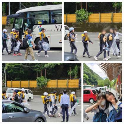 ラフティング体験のためウェットスーツに着替えて、スタート地点までバスで移動します。