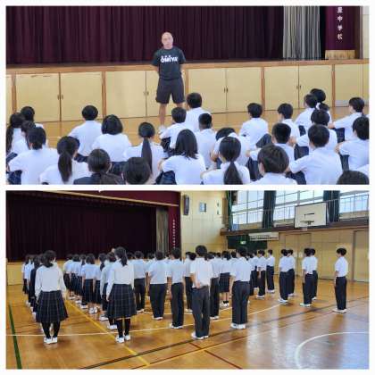 本日は朝から1年生が学年集会を行いました。担当の先生から暑さに負けず、熱中症対策をして頑張ってくださいとお話がありました。