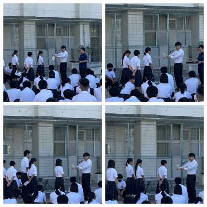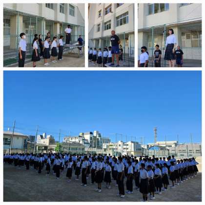 本日は朝から全校集会を行いました。バスケ部の選抜に選ばれた人の表彰伝達をしました。校長先生からオリンピックのお話と暑さがまだまだ続くので体調管理に気をつけてほしいとお話をしました。また、保健委員の人から今週は清掃強化週間なのでみんなで学校をきれいにしましょうとの呼びかけてくれました。