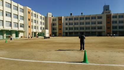 3年生女子の授業のようすです。持久走が始まり、本日は750mのタイムトライアルを行いました。雲ひとつない晴天のもと、一生懸命走っていました。