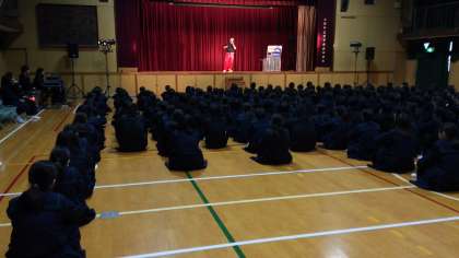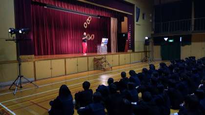 今年度の芸術鑑賞は、世界最高峰の神技を持つパフォーマー「ちゃんへん.」さんをお迎えしました。第1部のジャグリングでは、マイケル・ジャクソンなどの有名人の前でも披露された技の数々に、歓声が上がっていました。第2部では「失敗しない人間より諦めない人間になる」と題した講演を行い、在日朝鮮人として差別されてきた過去を振り返りながら、諦めずに頑張ることの大切さを伝えていただきました。第3部では「過去を変えずに未来を変える」をテーマにしたラップを通して、過去を受け入れ、現在・未来を力強く生き抜くメッセージを伝えてくれました。