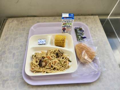 本日の給食は、ウインナーときのこの和風スパゲッティ、きざみのり、焼とうもろこし、固形チーズでした。パンは1/2サイズでスパゲッティやチーズを挟んで食べても美味しかったです。