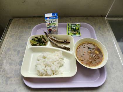 本日の給食は、焼きししゃも、さと芋のカレー風味汁、ささみとこまつなのいためものでした。さと芋のカレー風味汁はごはんにかけて食べる人もいたのではありませんか?ししゃもはすごく美味しかったです。