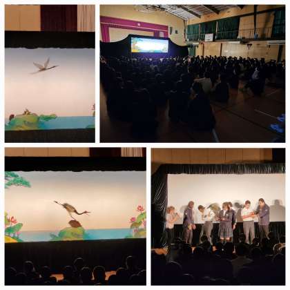 途中、代表生徒が実際に影絵を体験させてもらえる場面もあり、その難しさや楽しさを味わうこともでき貴重な体験となりました。3つ目の動画は、生徒が演じた鶴と魚のようすです。その難しさもあり、滑稽な鶴の動きに、会場も盛り上がったり、拍手が起こったりしていました。