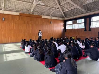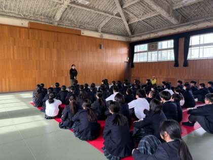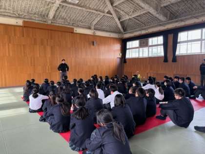 本日4時間目、今年最後の1年生学年集会が格技室で行われました。