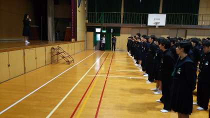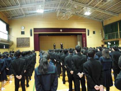 3学期始業式のようすです。まず最初に、新着任の教員の紹介をおこないました。保護者の皆様には、1月8日付けの文書でご連絡いたします。次に学校長より「今年1年も、確かな目標、綿密な計画、不断の努力をもって自分自身を成長させよう」という講話がありました。最後に生徒会会長より「今年も学校生活をしっかり頑張りましょう」という話がありました。