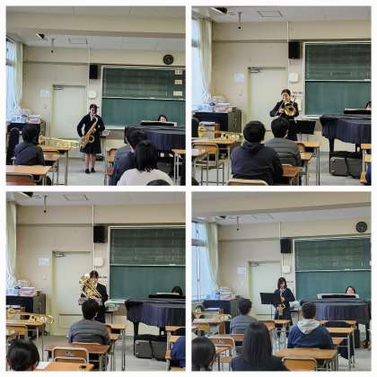 昨日の放課後に音楽室で、吹奏楽部のソロコンテストに出場する人がプレ発表会をしてくれました。全体での迫力ある演奏会と違って、一つひとつの楽器の音色の良さが伝わってきました。聞いている側でもほのぼのと癒されました。発表する皆さん、本番でも頑張ってください。