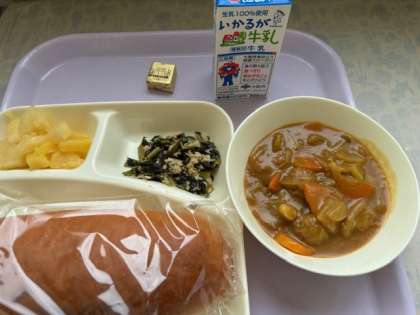 ・ミートボールと野菜のカレー煮・ツナとこまつなのソテー・パイナップル でした。