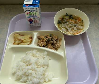 本日の献立は、豚肉と干しずいきの味噌煮、五目汁、焼きじゃが でした。