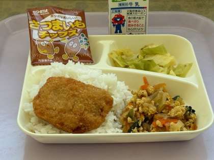 本日の献立は、カツ丼、キャベツの梅風味、いもけんぴフィッシュでした。