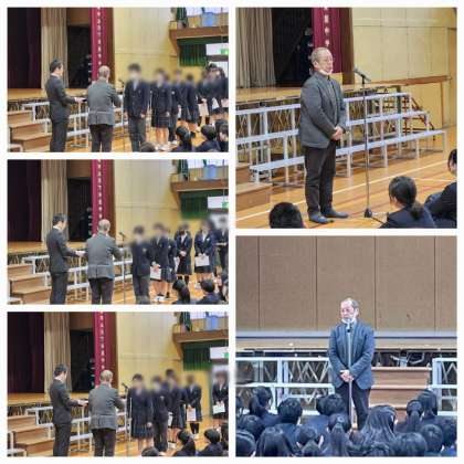 本日は朝から全校集会を行いました。まず初めに、西成区長さまが来校され、西成区年間読書冊数を達成した9人の皆さんを表彰していただきました。そのあとバドミントン部のダブルス入賞の表彰伝達を行いました。受賞の皆さん、おめでとうございます。