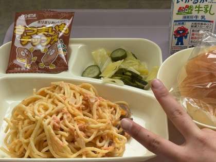 本日の献立は、さけのクリームスパゲッティー、キャベツときゅうりのサラダ、おさつチップス、ミニコッペパン でした。