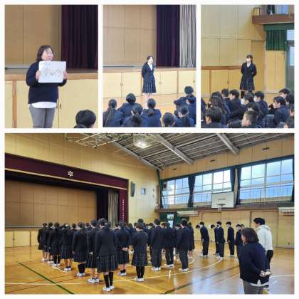 本日は朝から1年生が学年集会を行いました。担当の先生から、先週行った3年生を送る会に向けた1,2年生合同の歌練習についてのお話がありました。練習最後の歌は本当にすばらしかったこと、歌うときにおめでとうという気持ちを込めるとより伝わるということなど自身のエピソードを交えてお話してくれました。