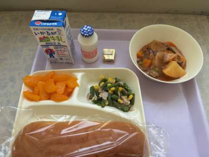 今日の献立は、ビーフシチュー・ベーコンとさんど豆のソテー・みかん(缶) 発酵乳