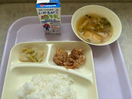 本日の献立は、鶏肉の竜田揚げ・五目汁・キャベツの梅風味 でした。