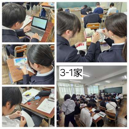 3年生の授業のようすです。数学では因数分解を練習していました。家庭科ではフェルトや裁縫を使って絵本の作成に取り組んでいました。