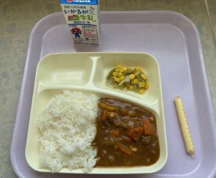 本日の献立は、牛肉と大豆のカレーライス・レタスとコーンのサラダ・棒チーズ でした。