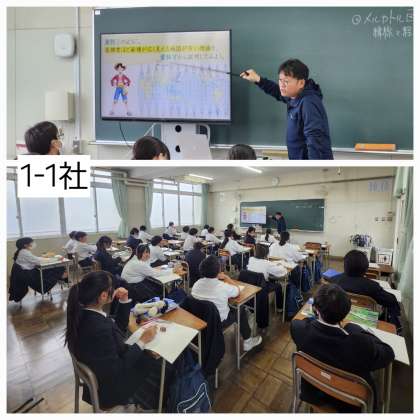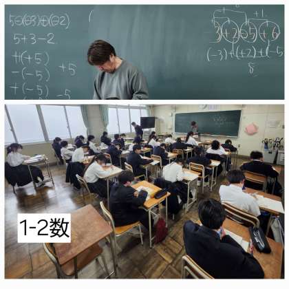 1年1,2組の授業のようすです。数学では、正の数負の数の計算に取り組んでいました。社会では地図を平面に表す方法を学んでいました。