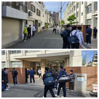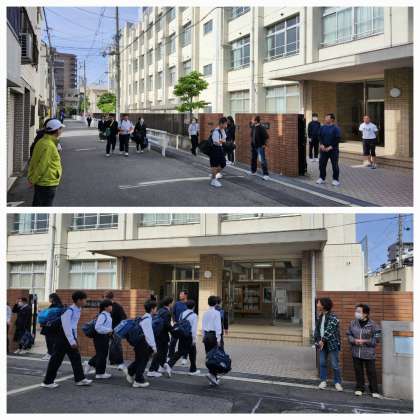 本日の朝登校のようすです。ゴールデンウィークも終わり、学校が始まりました。3年生は明日から修学旅行で前日注意の日となっており、体操服登校で荷物を持っての登校です。1,2年生の皆さんは今週3日間、頑張りましょう。