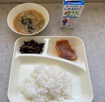 本日の献立は、あかうおの醤油だれかけ・みそ汁・ひじきの炒め煮 でした。