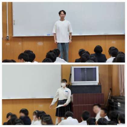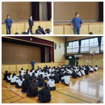 本日は朝から、1年生と2年生が学年集会を行いました。それぞれ担当の先生からお話がありました。2年生の担当の先生からは、落語を通じてこどもたちに伝えたいことをお話してくれていました。