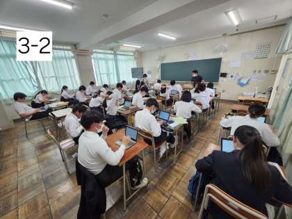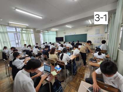 3年生が修学旅行の取組としてタブレットを使って新聞製作に取り組んでいました。1組と2組のようすです。