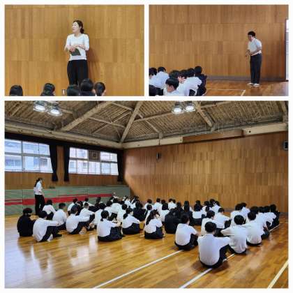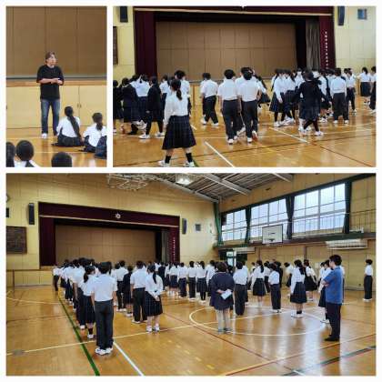 本日は朝から1年生と2年生が学年集会を行いました。2年生では担当の先生から今週のテストに向けての心構えのお話でした。1年生では来週行われる一泊移住の隊形、整列練習を行っていました。