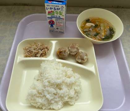 本日の献立は、焼シューマイ・鶏肉と春雨のスープ・ツナともやしの炒め物 でした。