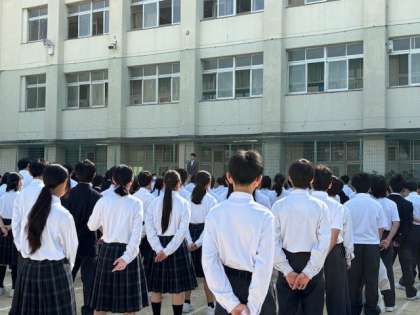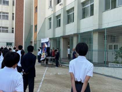 本日は朝から全校集会を行いました。教頭先生からいろいろな情報を得る方法として、SNSからだけでなく、新聞などの活字からの情報を得ることもできるとお話をしました。また、図書委員会から美術部の協力で「読書の木」を作成し、たくさんの本で行きましょうとの声かけがありました。