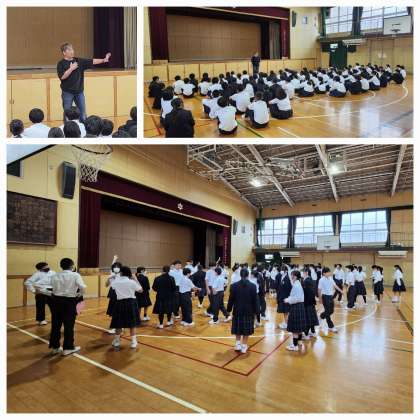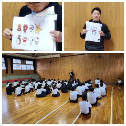本日は朝から1年生と2年生が学年集会を行いました。1年生ではあさってからの一泊移住の心がまえのお話や隊形整列の練習をしていました。2年生では担当の先生から日本で愛されるキャラクターの比率が1対1.414であることが多いとのお話をしてくれていました。