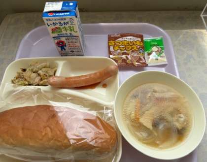 本日の献立は、ウインナーのケッチャップソース・スープ・焼ツナキャベツ・おさつチップス でした。ウインナーは一人一本ずつ。おかわりじゃんけんの時は、この1本を何等分にしたのでしょうか。人気メニューはつらいな〜!美味しくいただきました!